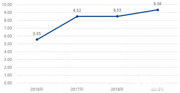 2015~2019年新能源汽車總銷量與公共充電樁保有量比值維持在8上下,2016年后比值緩慢上升。2016年新能源汽車增量與公共充電樁增量的比值為5.55。2017年、2018年維持在8.5,進入2019年上升到9.36。隨著充電市場的日趨成熟,運營企業(yè)已經(jīng)摒棄了跑馬圈地式運營,開始采取按需發(fā)展,適當(dāng)先行的策略,車樁增量比值在增大。